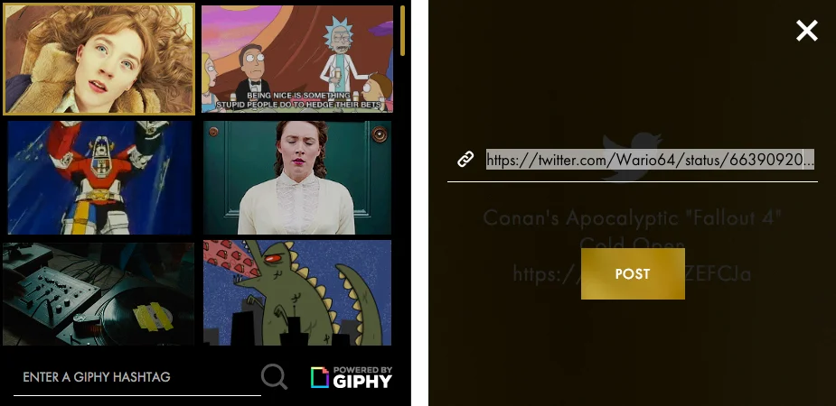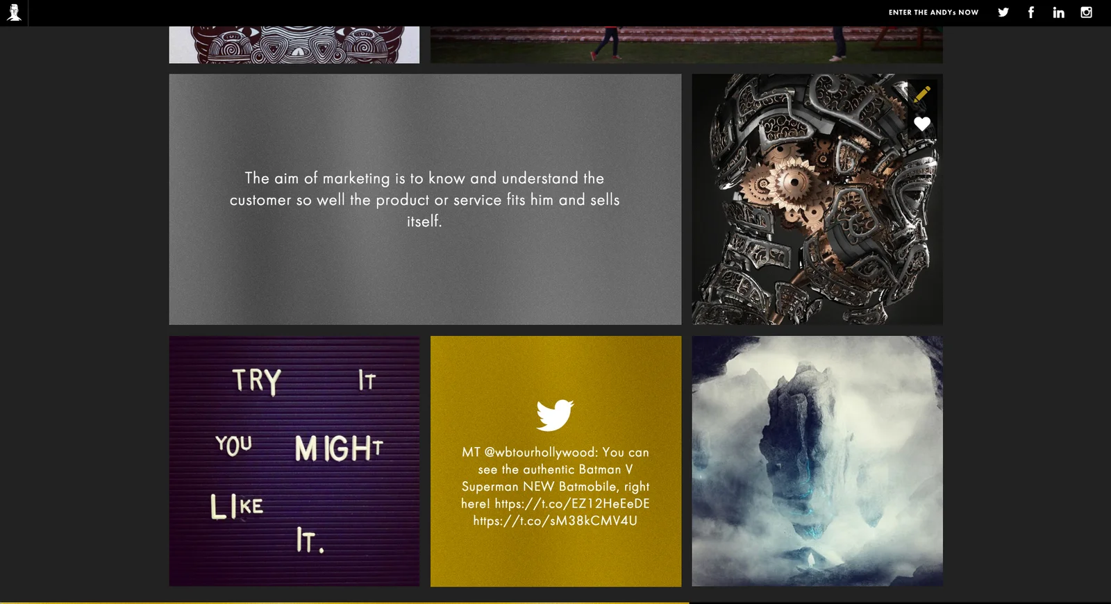 To easily aggregate the content users can submit, the site utilizes a full range of third-party APIs the resources would come from. It is a robust and interesting collage of Tweets, Instagrams, Flickr photos, YouTube, SoundCloud, Giphy, or single quotes, all representing the best content chosen by users.