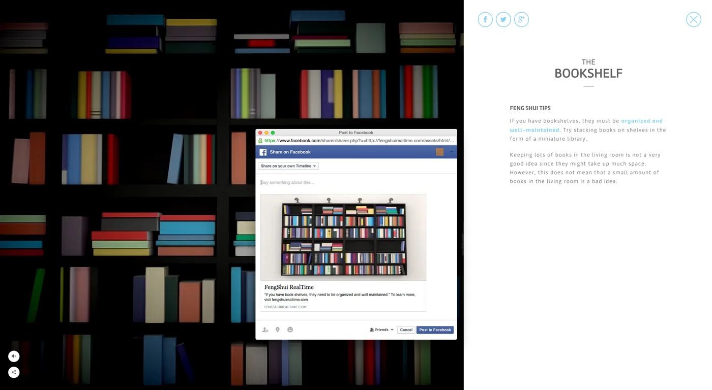 By unlocking more and more feng shui tips, the user could want to share some of his interesting discoveries. The feng shui book overlay collects all his achievements for sharing as well as reminds him there’s so much more to discover.