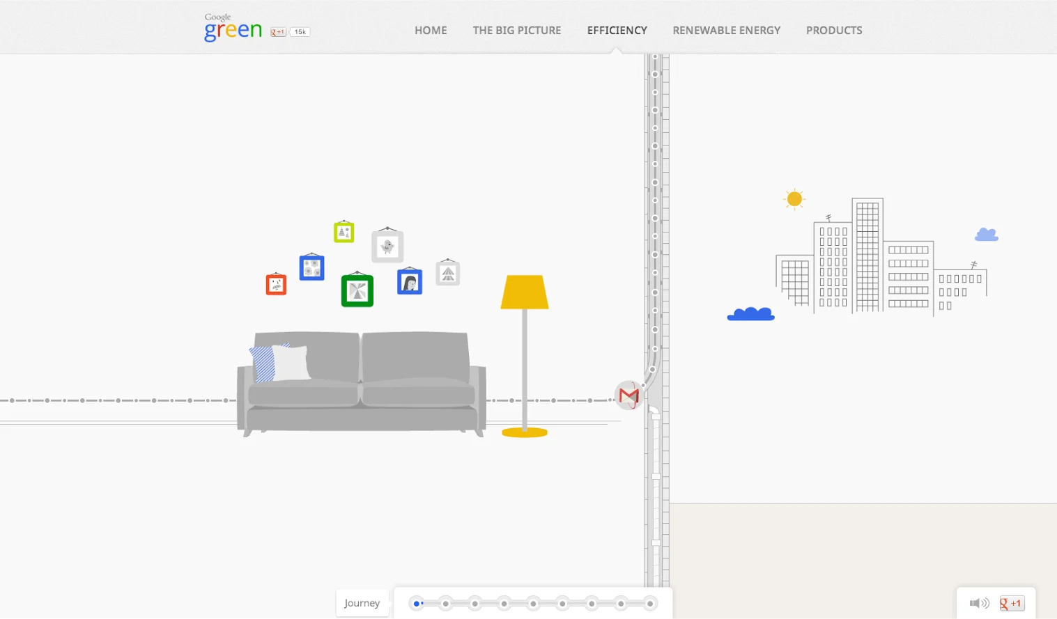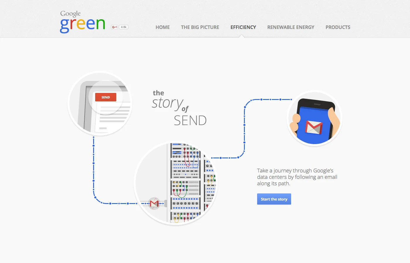 The long journey from “send” to inbox is visualized as a spline track. Along the way, it’s elaborated as a chain of technologies — a collection of stories told through animations and sounds. For each story, the user has a chance to read how their emails are carefully handled by Google as well as explore the facts through videos and photographs of Google’s data centers themselves.